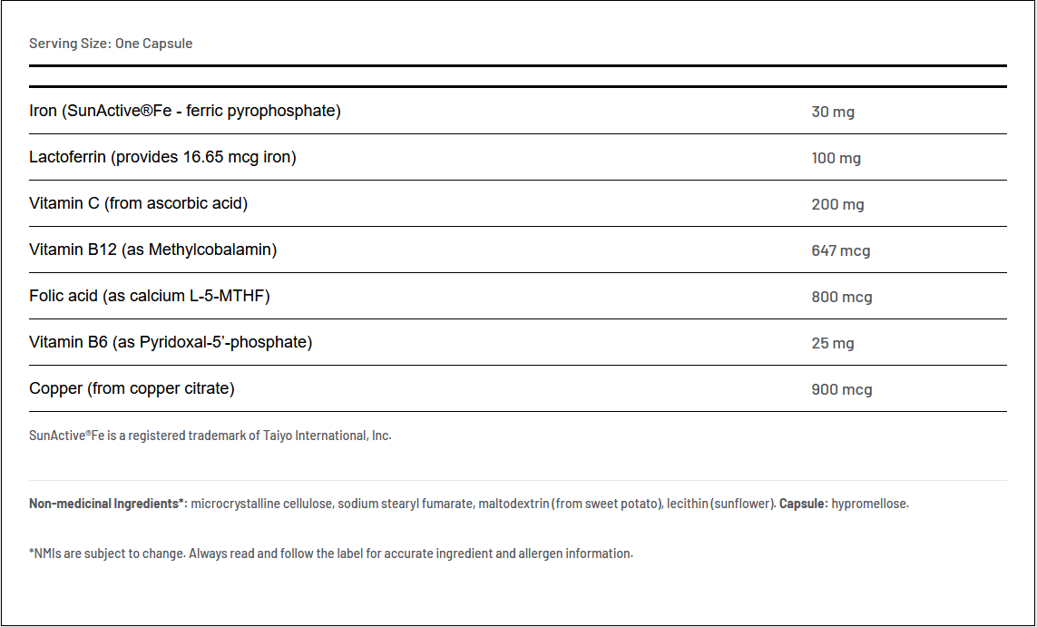 Ortho•Iron contains SunActive®Fe iron, a registered form of iron that animal studies have shown to be more bioavailable than other more common forms of iron such as ferrous sulphate and sodium ferrous citrate. Ortho•Iron also contains lactoferrin, an iron carrying protein shown to improve blood iron and hemoglobin levels, and vitamin C a well known antioxidant which also improves iron absorption. Other nutrients such as vitamin B12, folate, vitamin B6 and copper were also included in Ortho•Iron to ensure other anemias related to those nutrients do not go untreated. SunActive®Fe is a highly stable form of iron that is less prone to oxidation than the iron found in other supplements.
