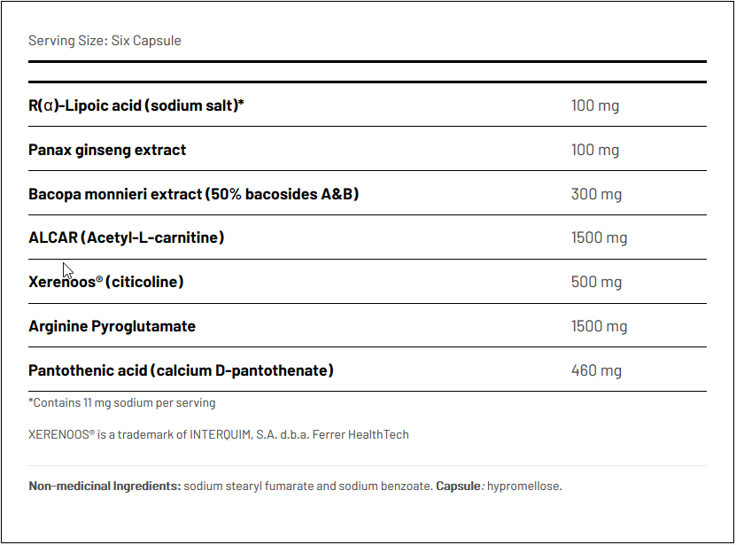 active ingredients (acetyl-carnitine, arginine pyroglutamate, citicoline, pantothenic acid, bacosides, Panax ginseng, R-lipoic acid), filler (microcrystalline cellulose, sodium stearyl fumarate) , capsule (hypromellose)