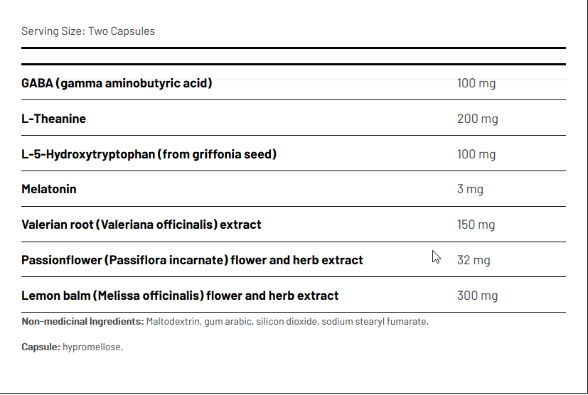 active ingredients (lemon balm extract, L-theanine, valerian root extract, GABA, L-5-hydroxytryptophan, passionflower extract, melatonin), filler (microcrystalline cellulose, maltodextrin, Arabic gum), anticoagulant (silicon dioxide), capsule (hypromellose)