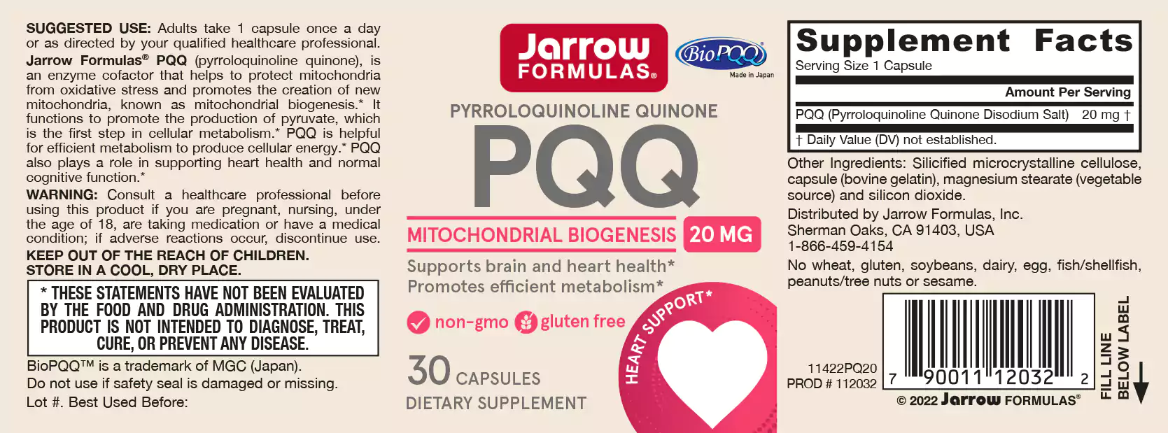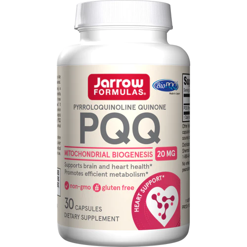 Jarrow PQQ  (pyrroloquinoline quinone) is an important antioxidant, promoting the creation of new mitochondria, and supports heart health and cognitive function.