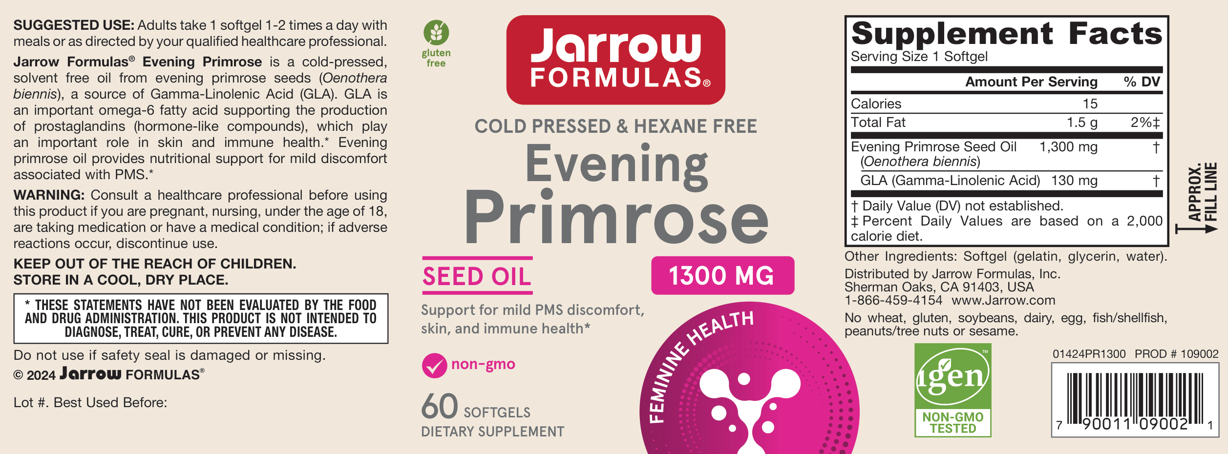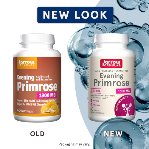 Jarrow Formulas Evening Primrose is a cold-pressed, solvent free oil from evening primrose seeds (Oenothera biennis), a superior source of Gamma-Linolenic Acid (GLA). GLA is an important omega-6 fatty acid needed for the production of beneficial prostaglandins (hormone-like compounds), which play an important role in promoting healthy skin and immune function.