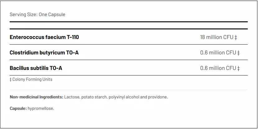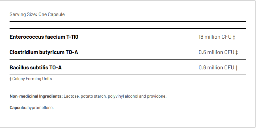Enterococcus faecium T-110 is a natural resident of the human gastrointestinal tract that produces lactic acid as a byproduct of carbohydrate fermentation. Lactic acid reduces the gastrointestinal pH thus preventing the growth of harmful bacteria.
