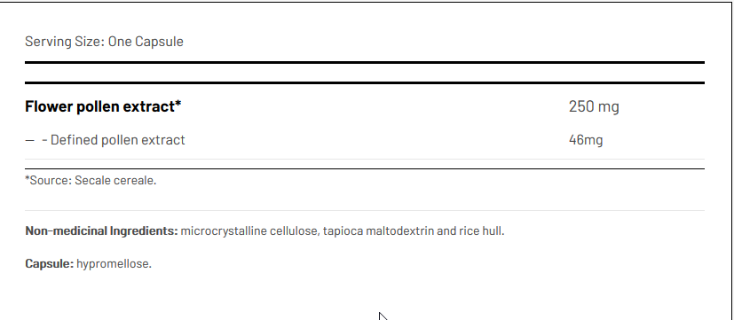 active ingredients (defined pollen extract), filler (microcrystalline cellulose, calcium hydrogen phosphate diyhydrate, calcium gluconate), anticoagulant (silicon dioxide), filler (maltodextrin), capsule (hypromellose)