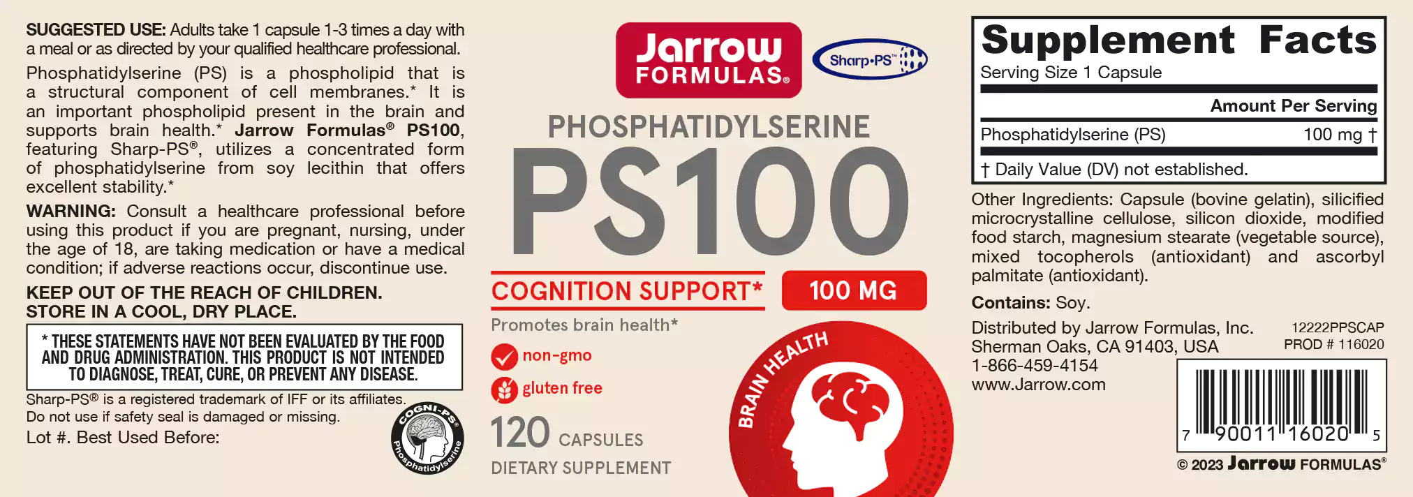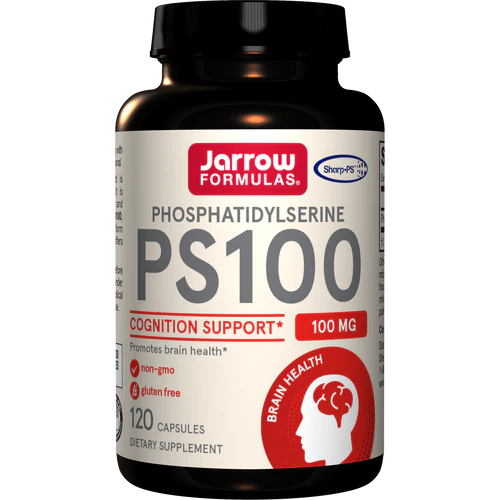 Jarrow Formulas PS-100 contains phosphatidylserine (PS), a phospholipid nutrient found in fish, green leafy vegetables, soybeans and rice, which is essential for the normal functioning of neuronal cell membranes and activates Protein kinase C (PKC) which has been shown to be involved in memory function.
