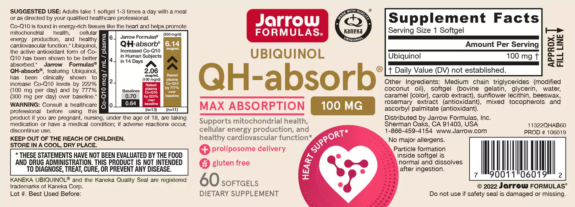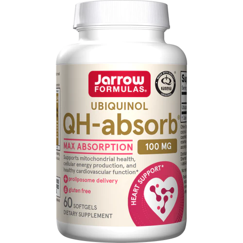 Jarrow Formulas QH-absorb is made with ubiquinol the more bioavailable, active-antioxidant form of CoQ10. It utilizes the Q-absorb natural, proliposomal delivery system for enhanced absorption beyond that of ubiquinol alone.