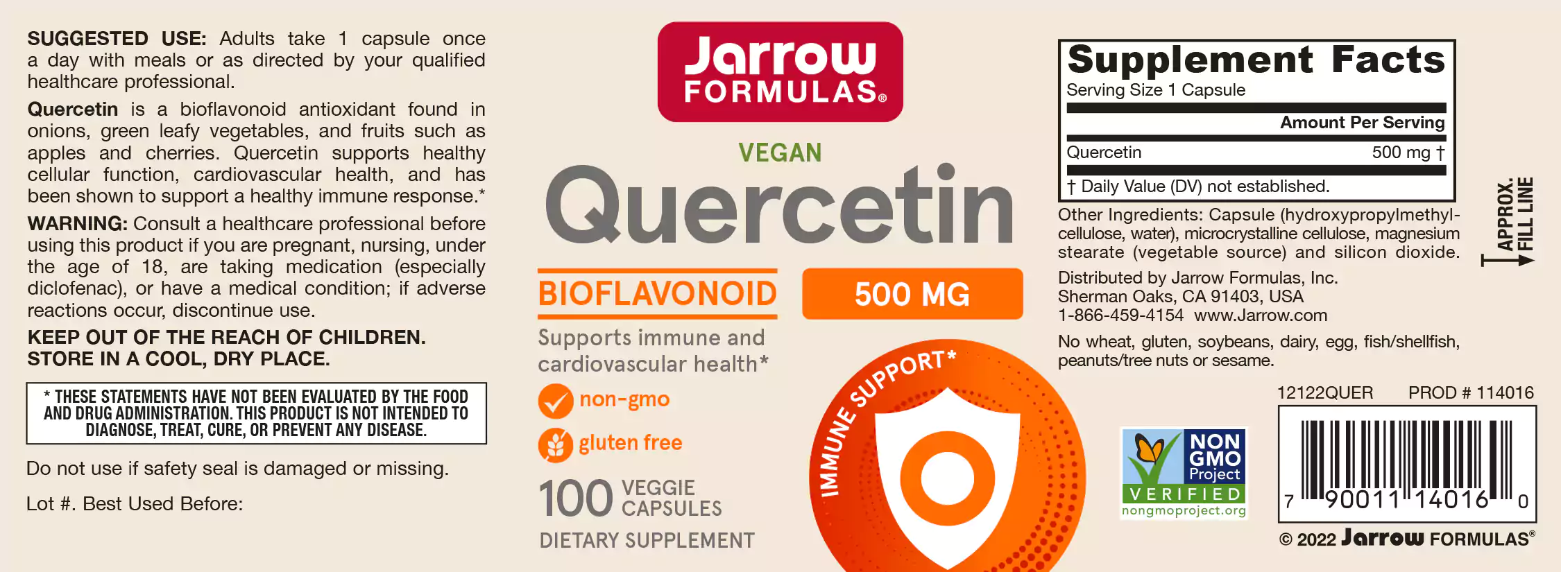 Jarrow Formulas Quercetin 500mg is a flavonol (a subclass of flavonoids) and is a potent antioxidant, providing cardiovascular protection by reducing oxidation of LDL cholesterol. Quercetin is one half of the rutin molecule, another flavonol, and is the more active antioxidant.