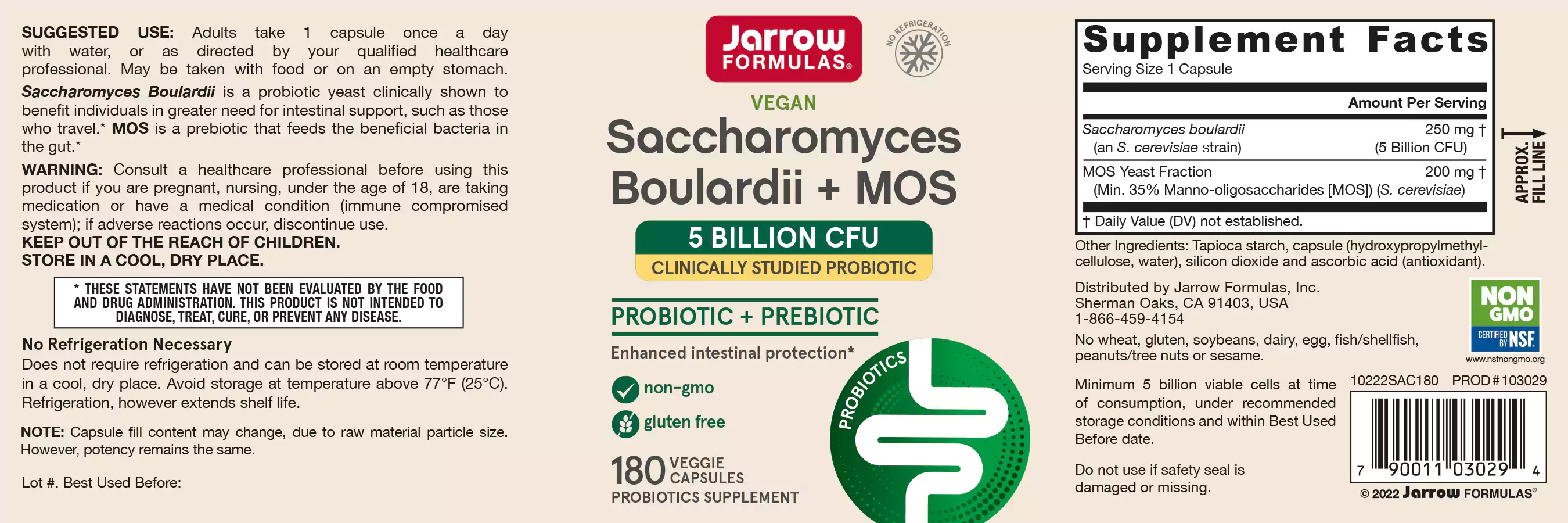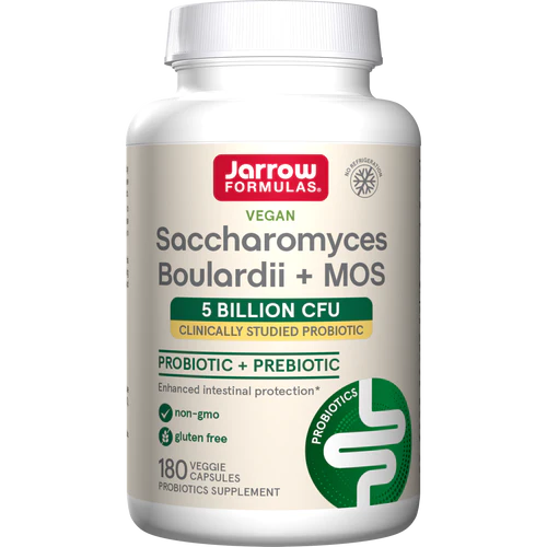 Jarrow Formulas Saccharomyces boulardii +MOS is a probiotic yeast that survives stomach acid and colonizes the intestinal tract. It promotes the health of the intestinal tract, helps protect its beneficial microbiota, and enhances immune function. MOS (MannanOligoSaccharide) is an oligosaccharide from the cell walls of Saccharomyces cerevisiae that can prevent bacteria from adhering to the epithelial cells and reduce their proliferation.