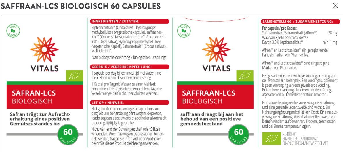 Saffron-LCS Organic (which stands for Lepticrosalides®, see below) contains the high-quality extract Affron®. Both the cultivation of the unsprayed, organic saffron and the manufacture of the saffron extract take place at producer Pharmactive in Spain. Because the entire production chain is under our own management, ideal cultivation conditions can be ensured and quality can be guaranteed. The producer also has DNA tests done on their saffron (not for nothing!) by an external party as extra confirmation that Affron® is made from 100% real saffron.
