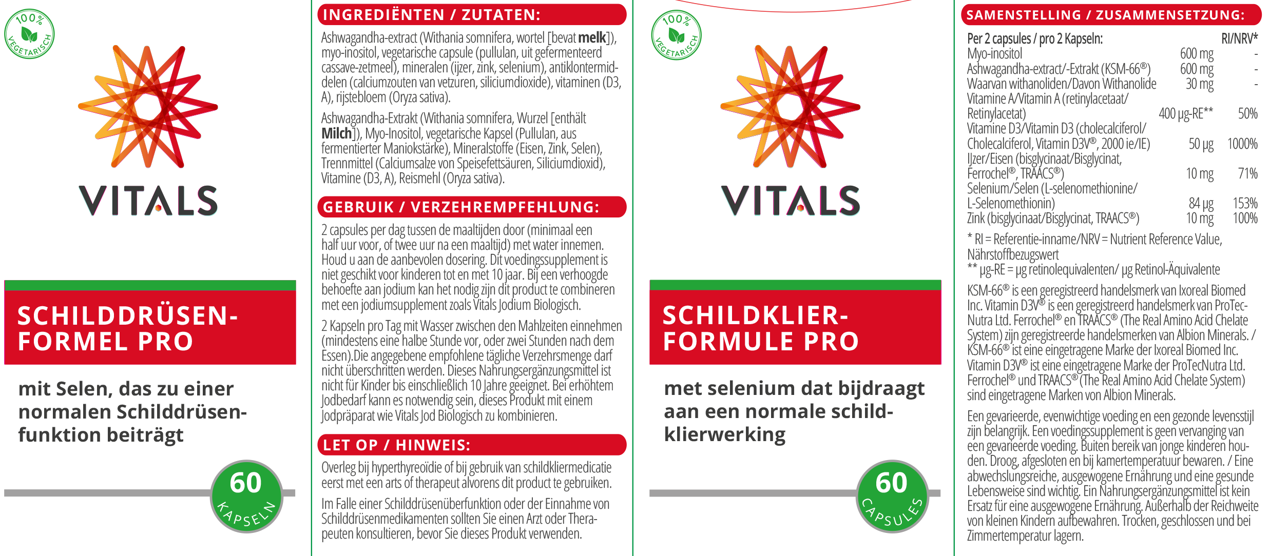 Vitals Schildklierformule PRO from Vitals contains a smart and well-researched selection of nutrients, with selenium as one of the main players. It is known that dietary intake of this trace element has come under pressure in recent decades. This while selenium does play an essential role in, among other things, the proper functioning of our thyroid gland. The thyroid gland has the highest selenium content of all tissues in the human body, which is why it is necessary to continue to ensure an adequate supply of selenium. After all, our body cannot produce trace elements such as selenium itself. Other nutrients in Schildklierformule PRO are myo-inositol, vitamin A, a generous dose of vitamin D3 from vegetable sources and two highly absorbable, amino acid-bound forms of iron and zinc. Supplemented with a highly effective extract from ashwagandha root with the brand name KSM-66®.