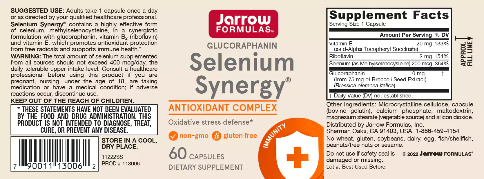 Jarrow Formulas Selenium Synergy contains the most effective selenium compound Methylselenocysteine, combined with glucoraphanin, Vitamin B2 (as riboflavin) and Vitamin E (as d-alpha tocopheryl succinate).