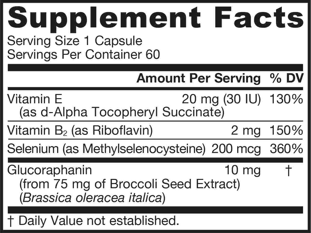 active ingredient (broccoli seed extract (Brassica oleracea italica) with glucoraphanin, d-alpha tocopherylsuccinate, riboflavin, methylselenocystein), filler (cellulose), capsule (bovine gelatin), filler (calcium phosphate, maltodextrin, vegetable magnesium stearate), anti-coagulant (silicon dioxide)