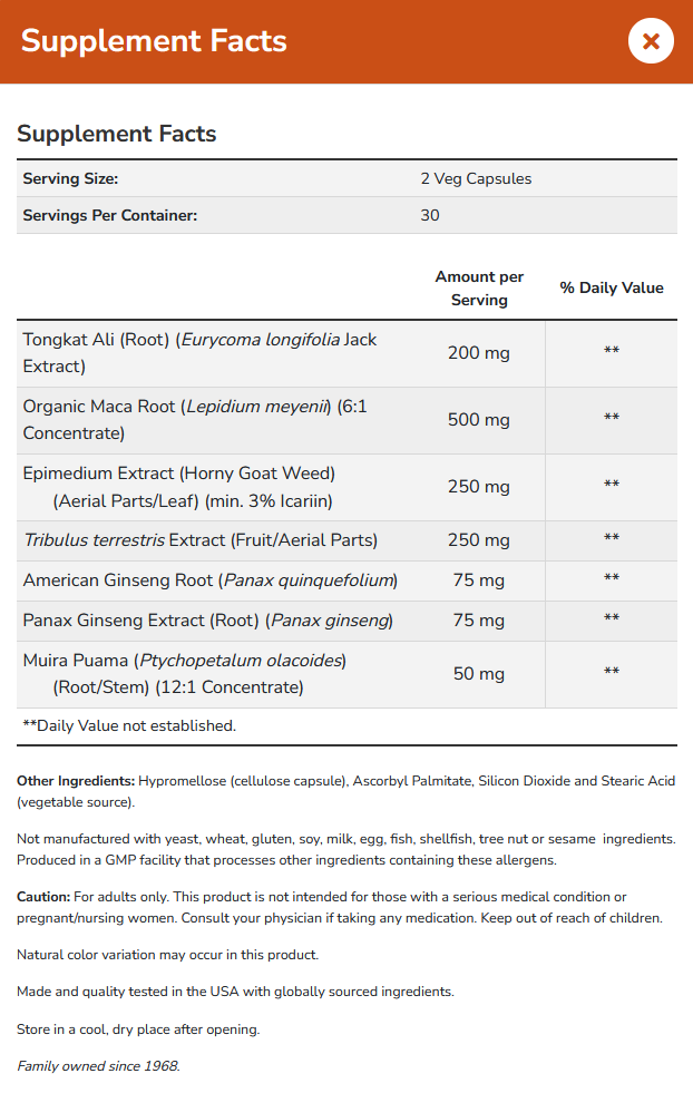 active ingredients (organic maca root, horny goat weed extract, tribulus extract, tongkat ali root, American ginseng root, Panax ginseng root, muira puama concentrate), v-capsule (hypromellose cellulose), filler (ascorbyl palmitate), anticoagulant (silicon dioxide), filler (vegetable stearic acid)