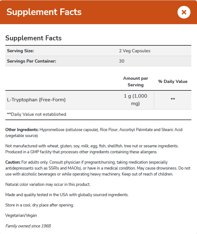 NOW L-Tryptophan 500mg is an essential amino acid; therefore, it is not synthesized by the body and must be obtained from the diet. L-Tryptophan is critical for the production of serotonin and melatonin, which help to support a positive mood, healthy sleep patterns, and proper immune system function. Every lot of NOW® L-Tryptophan is tested to be free of Peak E and microbial contamination.