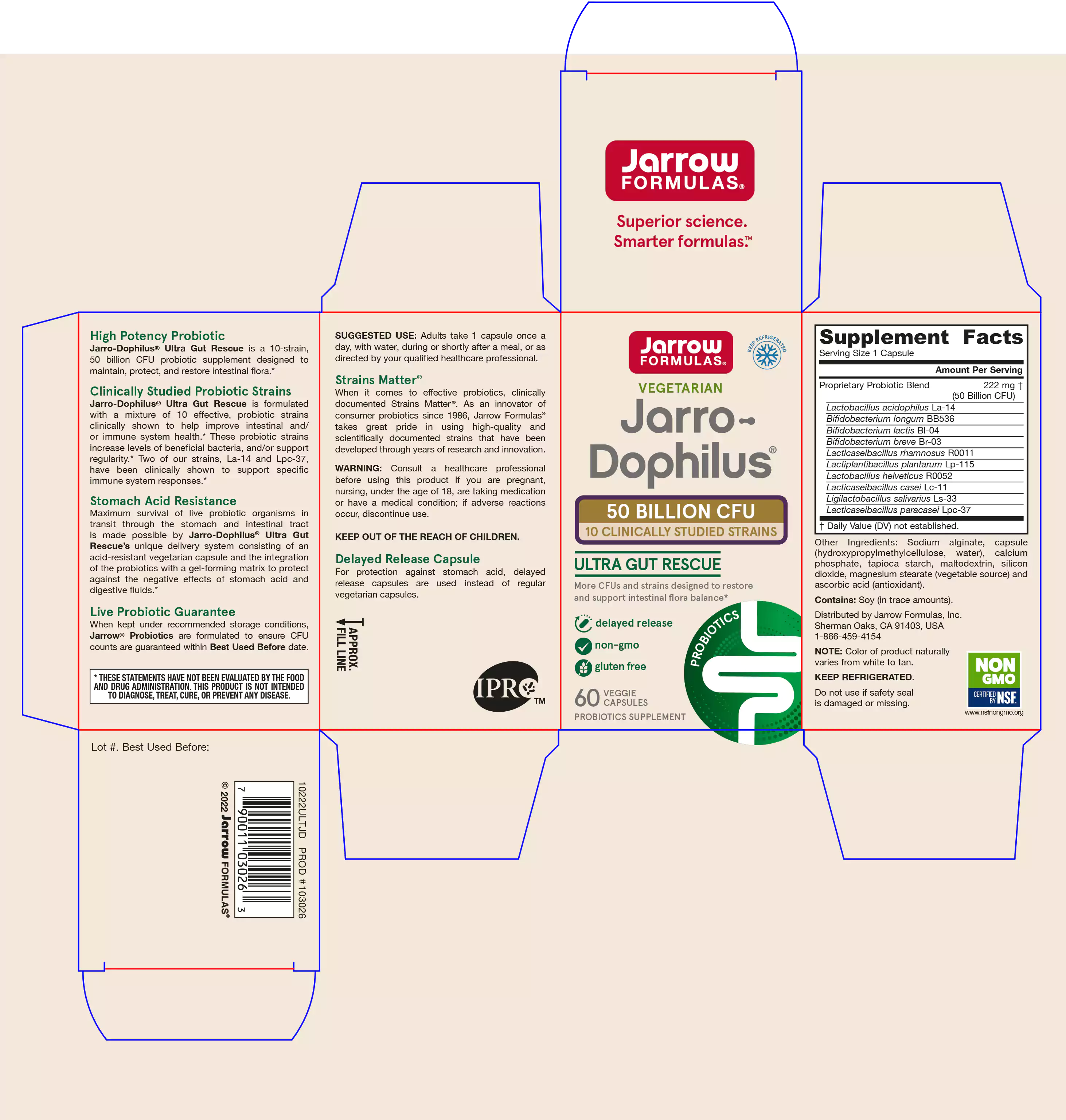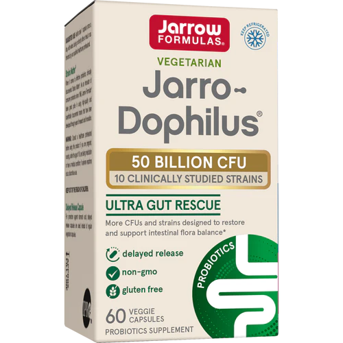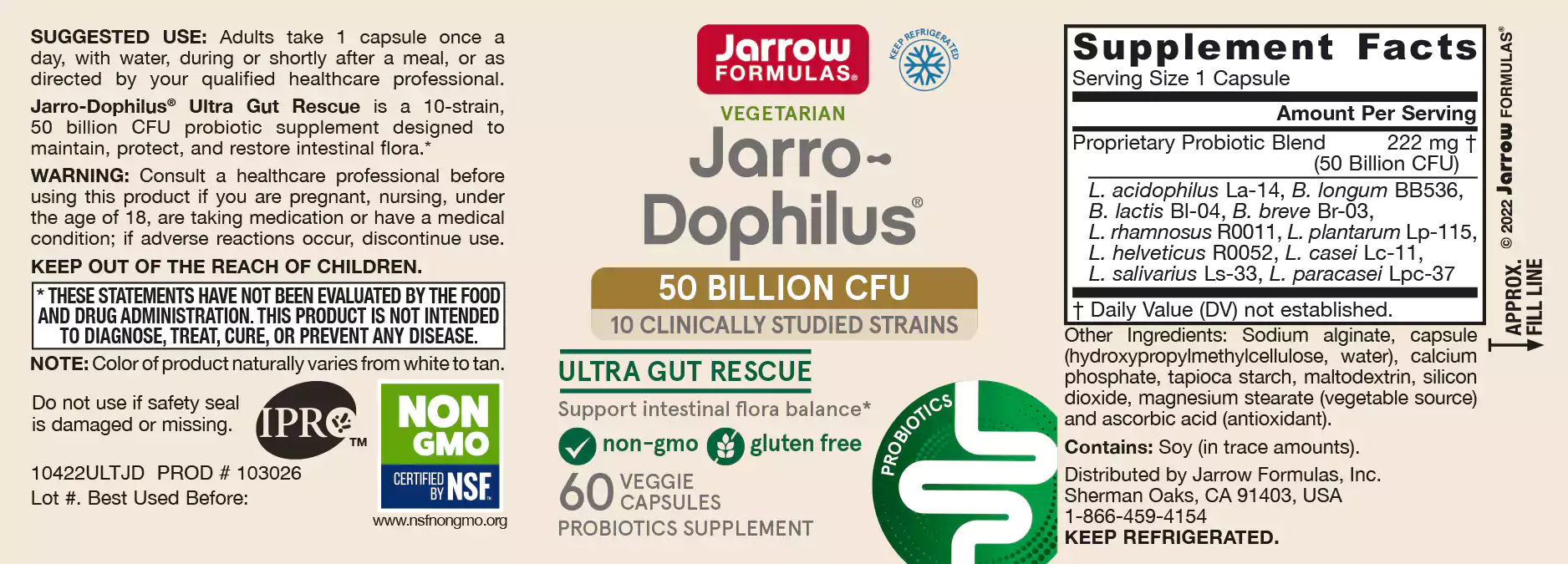 Jarrow Formulas Jarro-Dophilus Ultra Gut Rescue contains 50 billion total probiotic organisms and is designed to maintain, protect and restore intestinal flora.