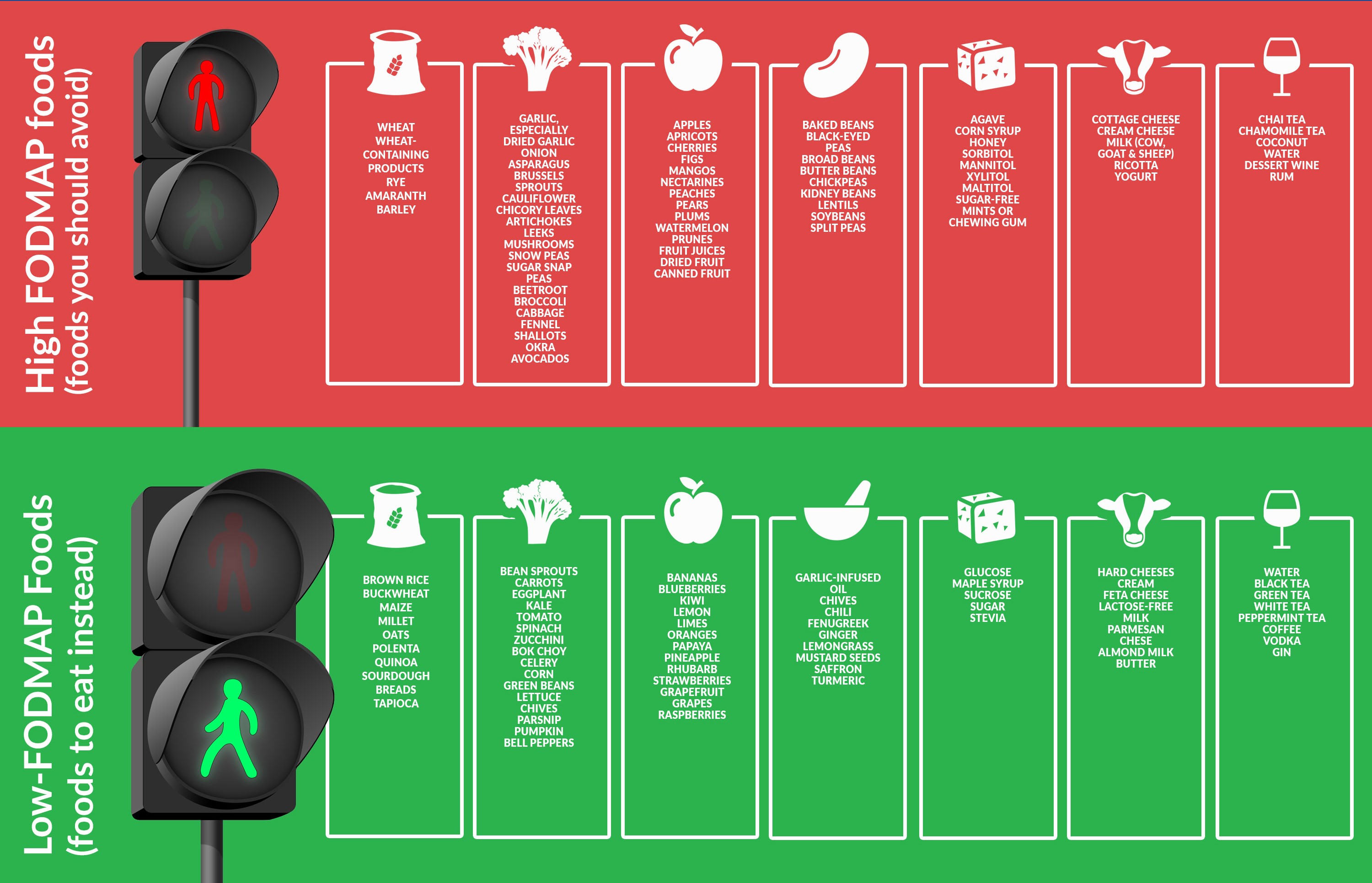 In Step 1, follow the Low FODMAP Diet by swapping high FODMAP foods in your diet for low FODMAP alternatives. For example, if you normally eat wheat-based toast with honey for breakfast, you could swap to sourdough spelt toast with jam.The Food Guide of the Monash FODMAP App is very useful in this step of the diet. Use the simple traffic light system to identify high (red) and moderate (amber) FODMAP foods that you will swap for low (green) FODMAP alternatives.