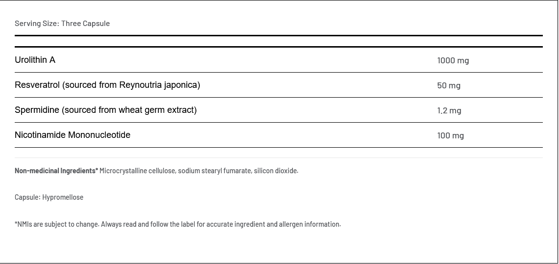 active ingredients (urolithin A, nicotinamide mononucleotide, resveratrol, spermidine), filler (microcrystalline cellulose, sodium stearyl fumarate), anticoagulant (silicon dioxide), v-capsule (hypromellose)