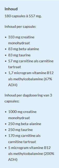 active ingredients (creatine monohydrate, carnitine tartrate, beta-alanine, taurine), capsule (HPMC), natural coloring agent (anthocyanins from purple carrot), active ingredient (methylcobalamin)