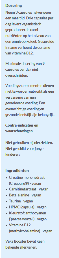 Until now, vegetarians and vegans have been a forgotten group when it comes to supplementing with creatine. With just 1 gram per day, the dose in two capsules of Vega Booster, you have the same intake of creatine as an ardent carnivore. This way you supplement muscle cells and possibly also brain cells with this special 'power booster'.
