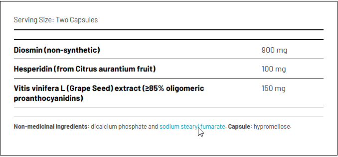 active ingredients (herbal extracts diosmin, hesperidin and grapeseed extract), filler (dicalcium phospate, sodium stearyl fumarate), v-capsule (hypromellose)
